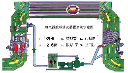 一、全自動膠球清洗系統(tǒng)的組成  1、電動二次濾網(wǎng) 2、電動收球網(wǎng) 3、電動裝球室 4、膠球泵 5、電動分匯器 6、PLC控制柜 7、電動閥門和管路